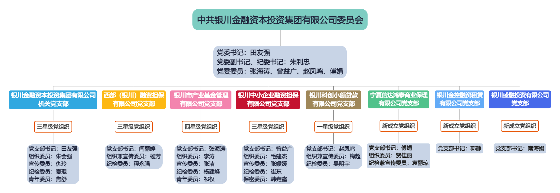 銀川金融資本投資集團(tuán)有限公司黨委于2019年12月6日成立,在銀川市委、市政府及市國(guó)資金融黨工委的領(lǐng)導(dǎo)下,堅(jiān)持以習(xí)近平新時(shí)代中國(guó)特色社會(huì)主義思想為指導(dǎo),堅(jiān)持正確的政治方向,宣傳貫徹落實(shí)黨的路線方針政策,嚴(yán)格按照上級(jí)有關(guān)部署開展各項(xiàng)工作,有效發(fā)揮黨建在企業(yè)經(jīng)營(yíng)管理中管大局、把方向的政治引領(lǐng)作用。集團(tuán)黨委目前設(shè)立7個(gè)黨支部:中共銀川金融資本投資集團(tuán)有限公司支部委員會(huì)、中共西部(銀川)融資擔(dān)保有限公司支部委員會(huì)、中共銀川市產(chǎn)業(yè)基金管理有限公司支部委員會(huì)、中共銀川中小微企業(yè)科技小額貸款有限公司支部委員會(huì)、中共銀川中小企業(yè)融資擔(dān)保有限公司黨支部,中共銀川金控融資租賃有限公司黨支部,中共寧夏信達(dá)鴻泰商業(yè)保理公司黨支部?,F(xiàn)有黨員104人,其中正式黨員101人、預(yù)備黨員3人、發(fā)展對(duì)象8人、積極分子32人。